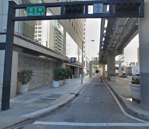 The garage has entrances on SE 2nd Street (far left) just before the SE 3rd Ave street light and on SE 3rd Street (left side) immediately passing SE 3rd Avenue. Look for the giant P Parking blade sign
